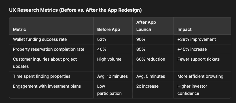 2%90%+38% improvementProperty reservation completion rate40%85%+45% increaseCustomer inquiries about project updatesHigh volume60% reductionFewer support ticketsTime spent finding propertiesAvg. 12 minutesAvg. 5 minutesMore efficient browsingEngagement with investment plansLow participation2x increaseHigher investor