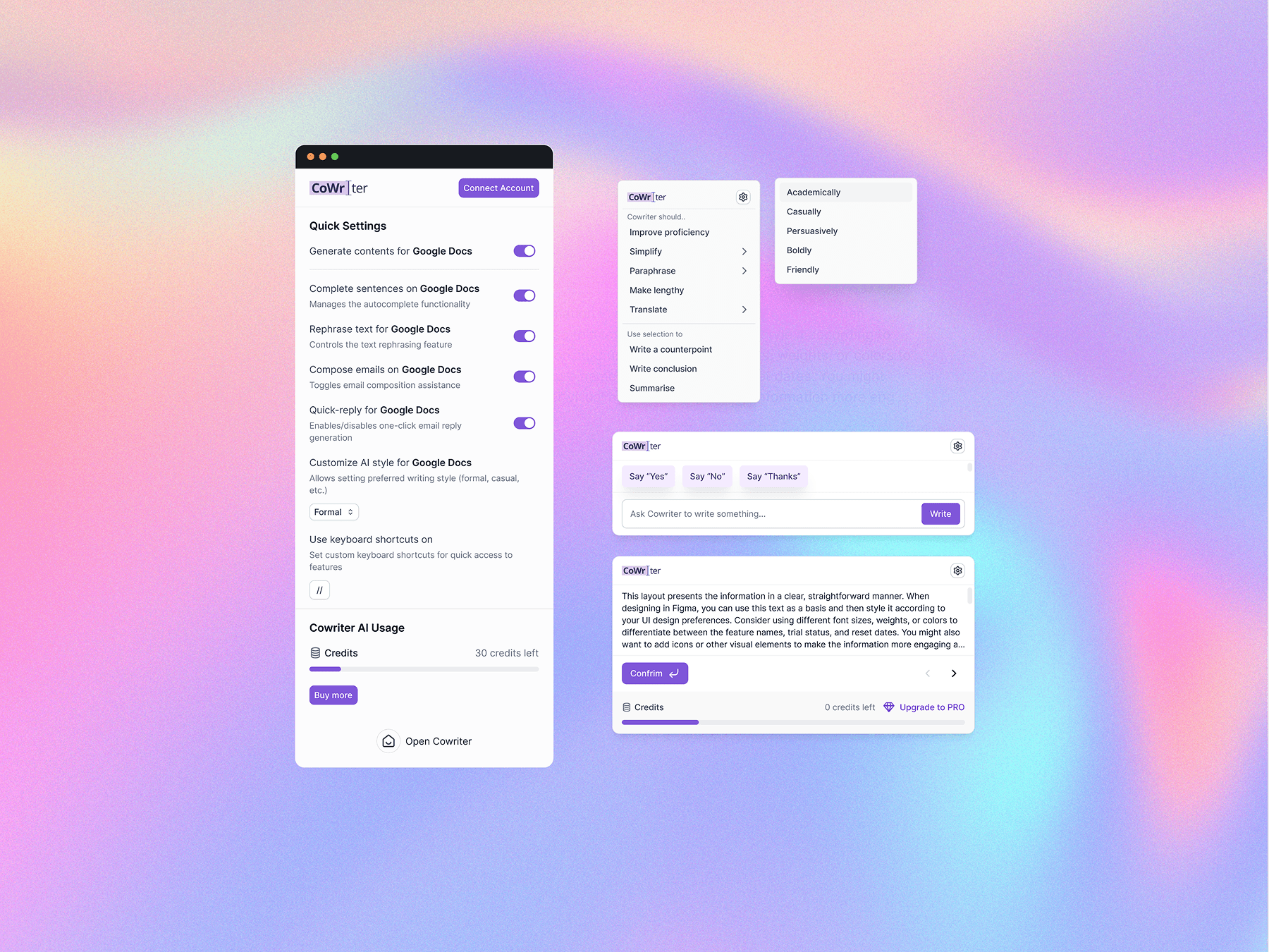 I designed a chrome extension for a Cowriter which helps their users use their product in gmail, word documents or editor