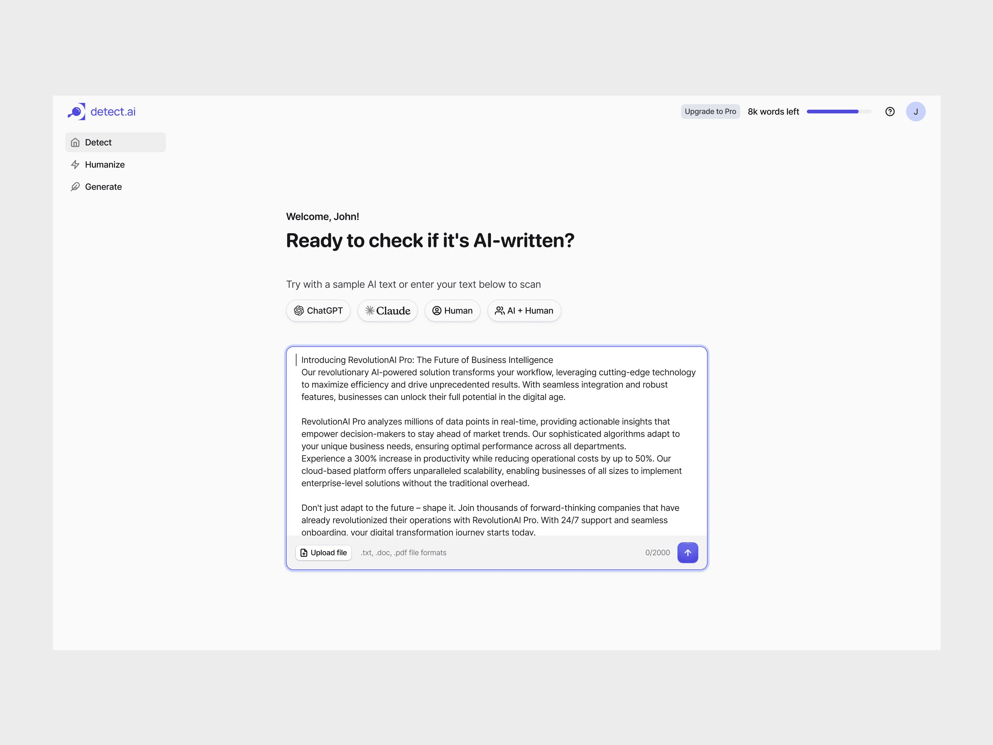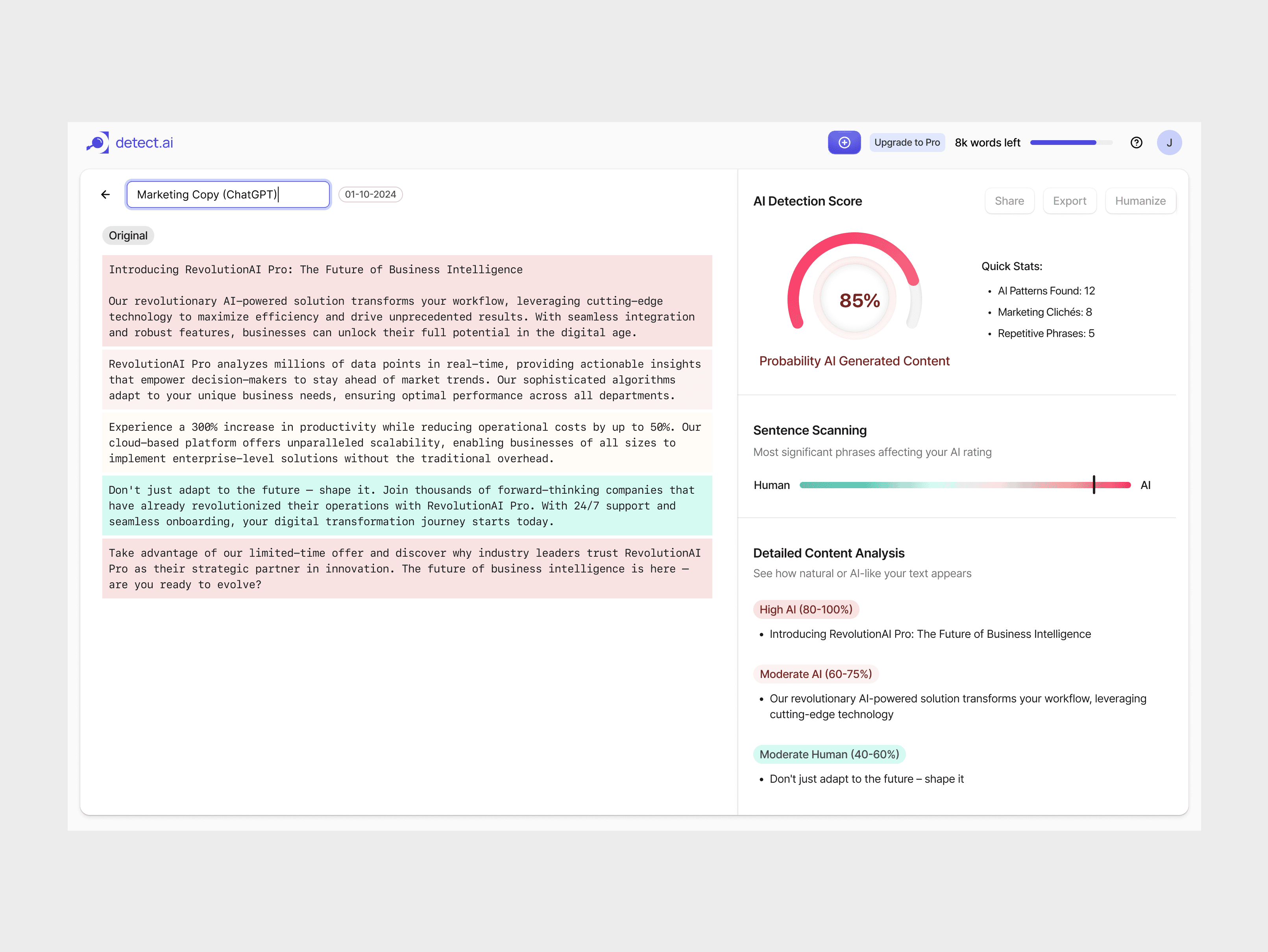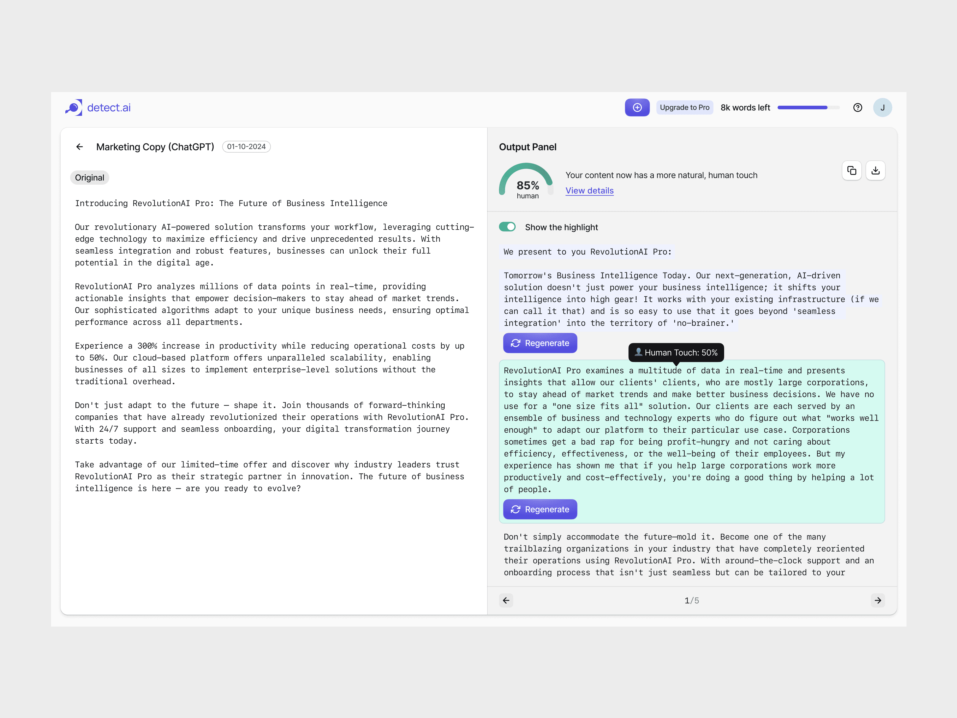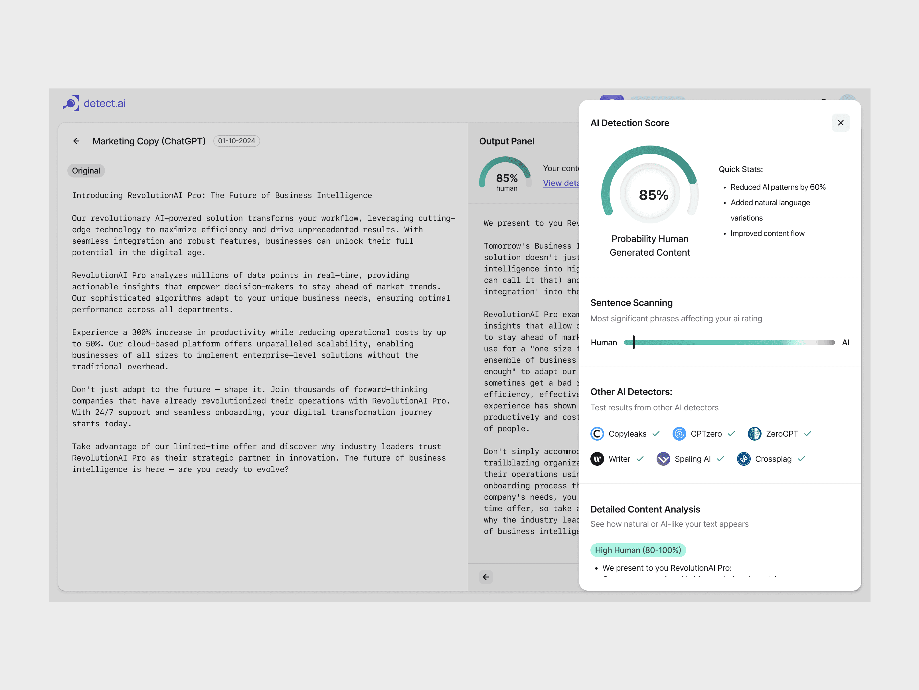 Detect platform that detects AI-generated content and transforms it to sound more human-written.